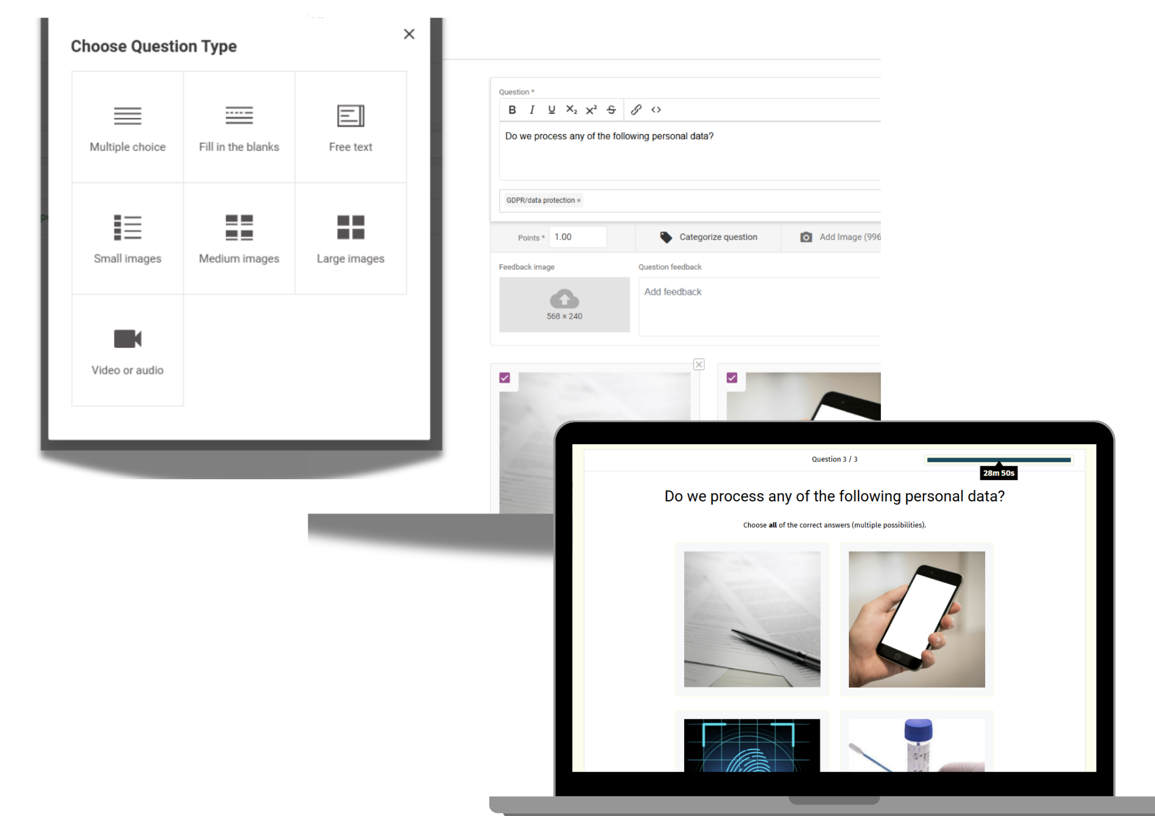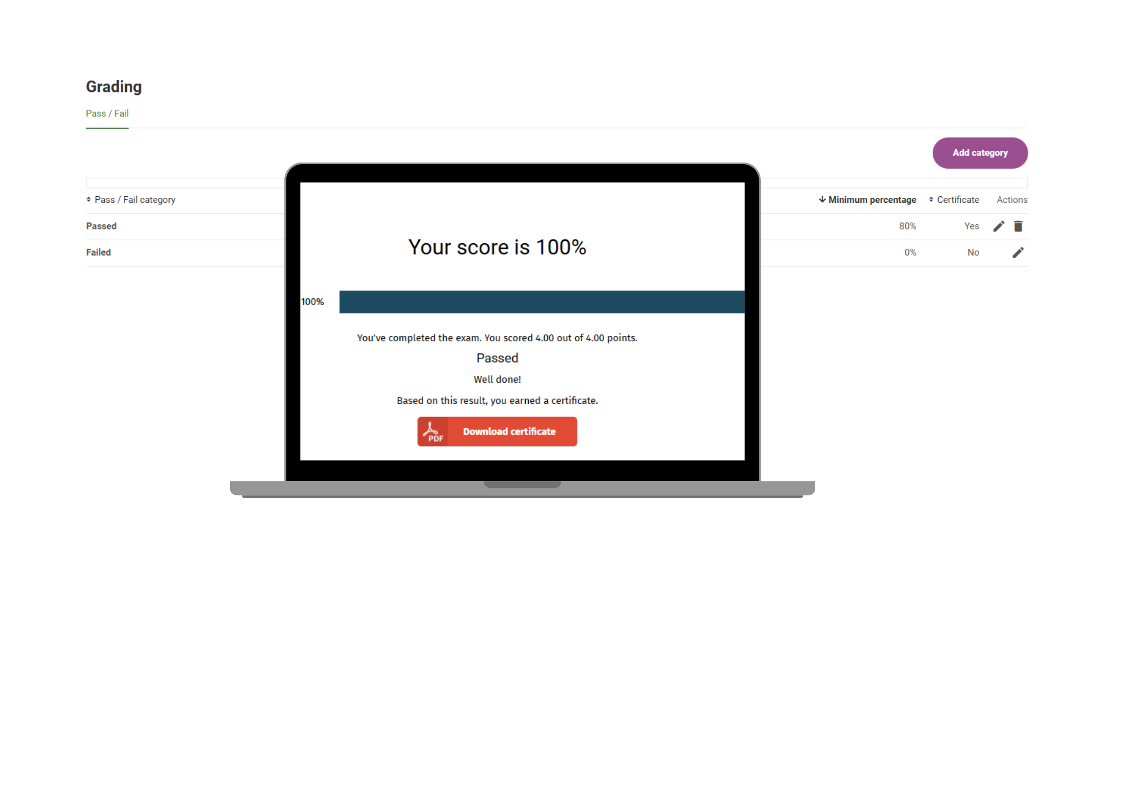 Nuestro creador de exámenes se encarga de tareas que requieren mucho tiempo, como calificar, generar pruebas aleatorias y enviar certificados, ¡lo que te libera para concentrarte en lo más importante!